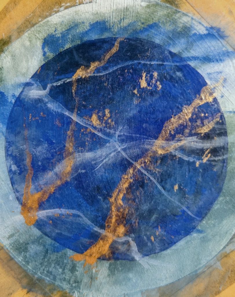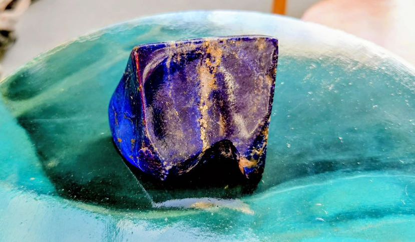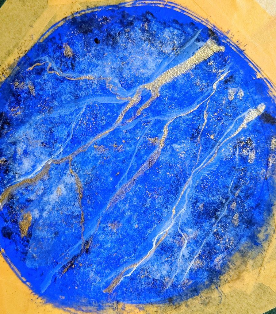 Eine völlig neue Steinimitation ist die Optik eines besonderen Edelsteins, dem Lapislazuli. Ein Stein, der sehr selten vorkommt und schon seit über 6000 Jahren in Afghanistan abgebaut wird. Sein leuchtendes Blau ist wunderschön. Früher wurde der Stein gemahlen, um das Pigment herzustellen, heute wird es synthetisch hergestellt und ist ein Pulver. Das Pigment wird in Wasser einsumpfen lassen und mit einem Bindemittel versetzt. Unsere Lehrerin Berit zeigte uns einen Stein und wie wir diesen imitieren konnten. Man muss sagen, es ist ein wunderschönes Blau. Wir haben so genannte Adern eingezeichnet und manche schon die Goldeinschlüsse nachgebildet.