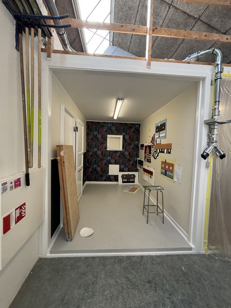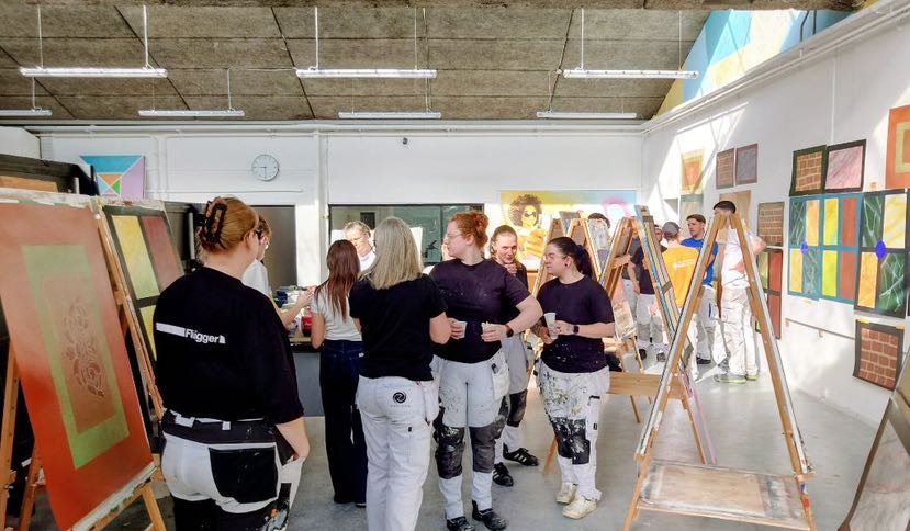 Die Schule ist für den Malerberuf sehr gut ausgestattet. Es gibt hier verschiedene Übungskabinen sowie realitätsnahe Arbeitsbereiche mit eingebauten Türen, Ecken, Vorsprüngen und Holzleisten. Dadurch kann man sehr praxisnah arbeiten. Eine Tatsache, die ich besonders beeindruckend fand, weil diese Lernumgebung noch näher an der Realität ist, als ich es von uns kenne.