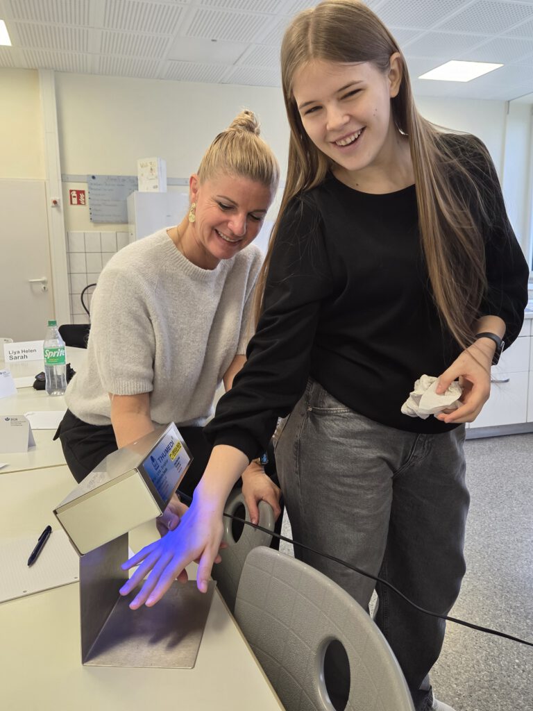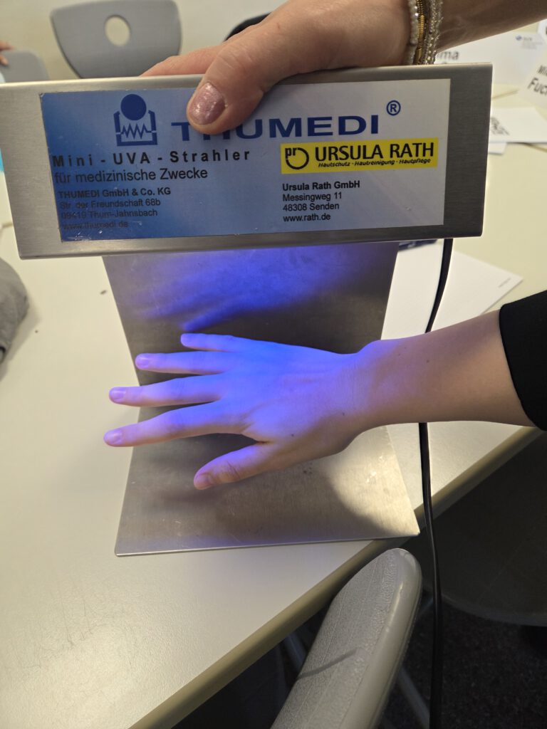 Im Rahmen des Hautschutzthemas konnten die Teilnehmenden mithilfe eines UV-Geräts sichtbar machen, wie gut die Hände eingecremt sind.