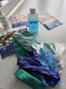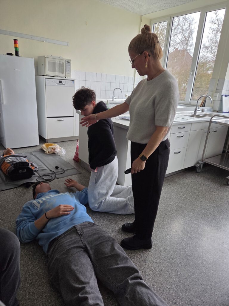 Im Weiteren wurden die Inhalte in zwei Teilgruppen vertieft. Eine Gruppe beschäftigte sich intensiv mit dem Thema Hautschutz und Erste Hilfe. Dabei ging es um den richtigen Umgang mit Reinigungs- und Desinfektionsmitteln, den Einsatz von Schutzhandschuhen sowie um geeignete Hautpflege. Mithilfe eines UV-Geräts wurde anschaulich gezeigt, wie wichtig das gründliche Eincremen der Hände ist. Ergänzend wurden grundlegende Erste-Hilfe-Maßnahmen aufgefrischt. Ein Hautschutz-Quiz sorgte für Abwechslung und festigte das vermittelte Wissen.