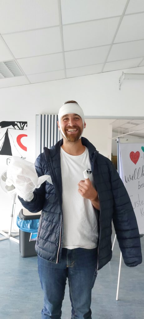 Im Mittelpunkt des Lehrgangs stand das Ziel, im Notfall schnell und korrekt handeln zu können. Die Teilnehmenden wiederholten dabei nicht nur grundlegende Maßnahmen der Ersten Hilfe, sondern trainierten diese auch praxisnah und realitätsorientiert. Unter Anleitung wurden unter anderem verschiedene Verbandtechniken geübt, die im schulischen Umfeld – etwa bei Sportverletzungen oder Unfällen im Unterricht – häufig erforderlich sind.