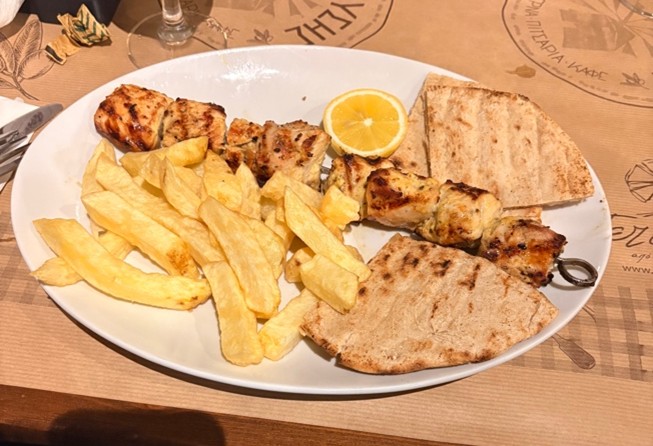 Top-Tipp: Chicken Souvlaki wird auf Spießen serviert. Als Beilage gibt es Pita, Salat und Pommes dazu. Und natürlich darf das Zaziki nicht fehlen.